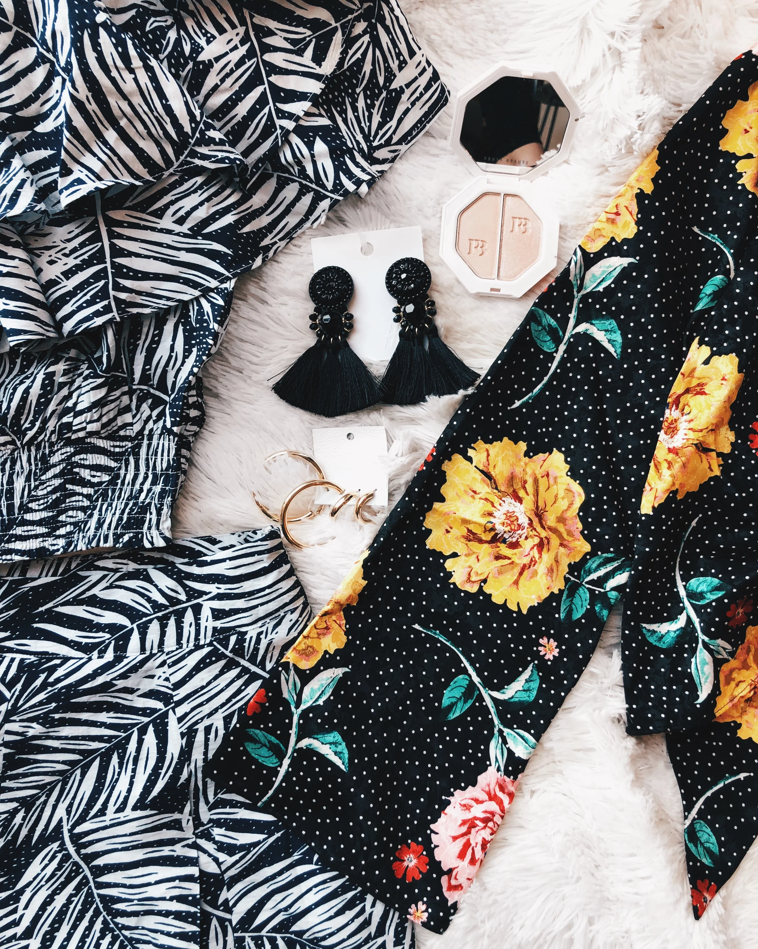 floral top | black earrings | Fenty highlight | hoop earring set | white dress